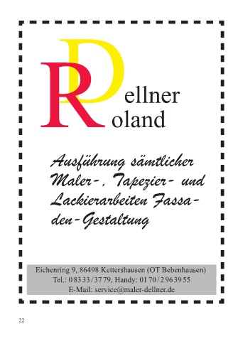 D ellner R oland Ausführung sämtlicher Maler-, Tapezier- und Lackierarbeiten Fassa- den-Gestaltung Eichenring 9, 86498 Kettershausen (OT Bebenhausen) Tel.: 08333/3779, Handy: 0170/2963955 E-Mail: service@maler-dellner.de 22
