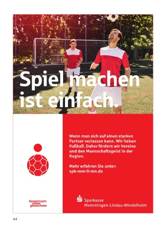 Spiel machen ist einfach. Wenn man sich auf einen starken Partner verlassen kann. Wir lieben Fußball. Daher fördern wir Vereine und den Mannschaftsgeist in der Region. Mehr erfahren Sie unter: spk-mm-li-mn.de 44